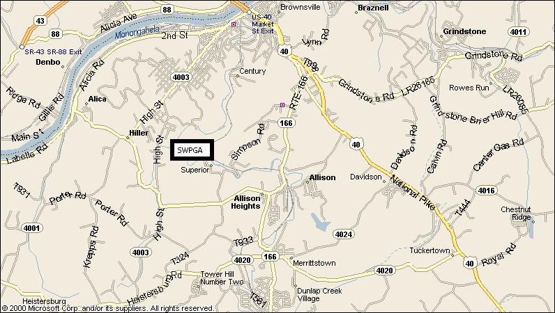 Going west from Uniontown: go 6 3/4 miles on route 40 and turn left at the Jackson Farms convenience store. Go 5 miles untill you see a sign that says: Brownsville 4 miles. Turn right at this sign and go exactly 2.7 miles. Turn right onto dirt road at SWPGA sign.